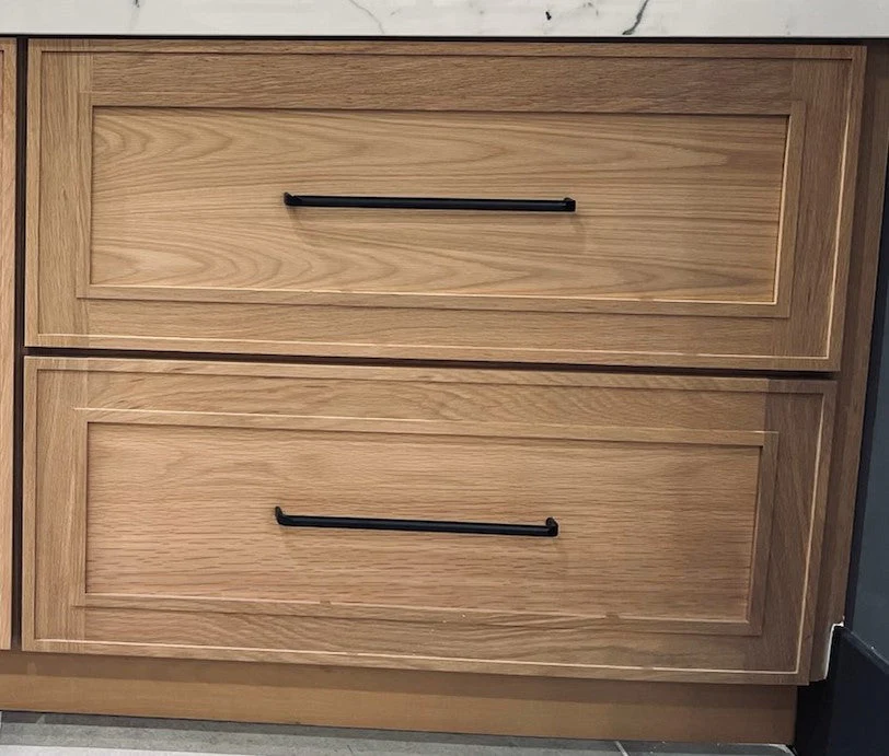 The cabinet has two drawers each with full extension and soft-close glides from the manufacturer DTC. The cabinet face is made of solid oak wood and is 3/4" thick, including a 3/4-inch framed Elegant design door.